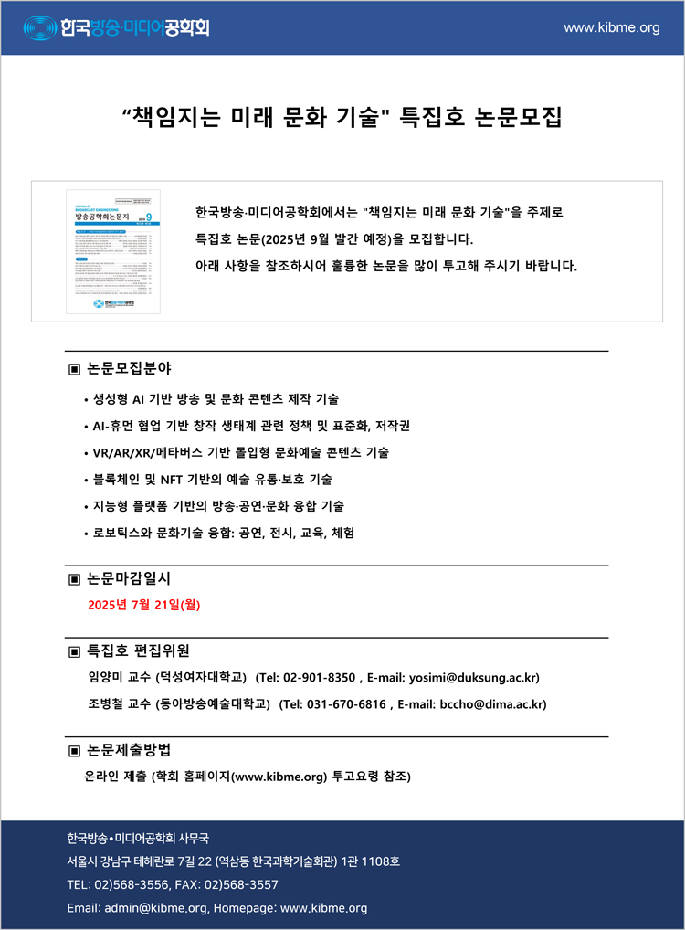 [논문모집] 방송공학회논문지 특집호 '책임지는 미래 문화 기술' (30권 5호, 2025년 9월 발간)