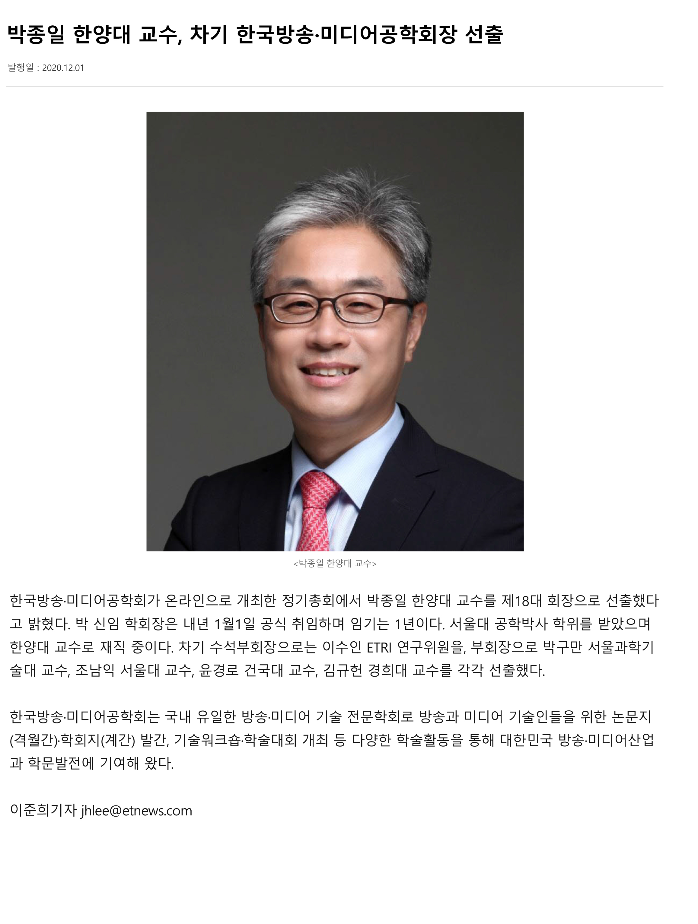 [전자신문] 박종일 한양대 교수, 차기 한국방송·미디어공학회 회장으로 선임