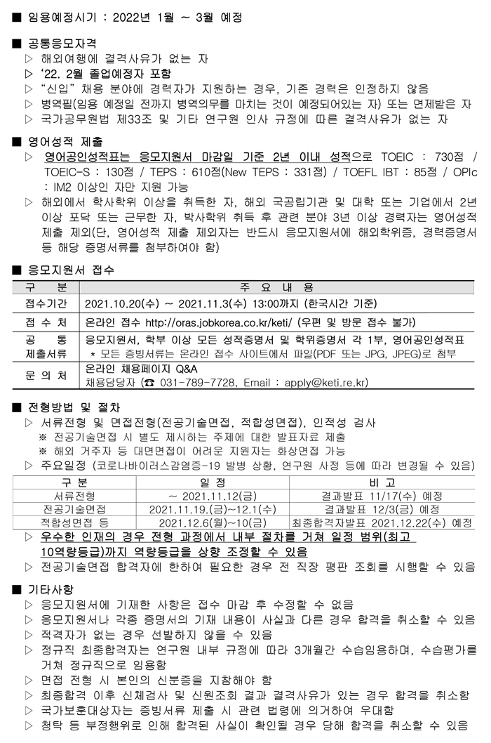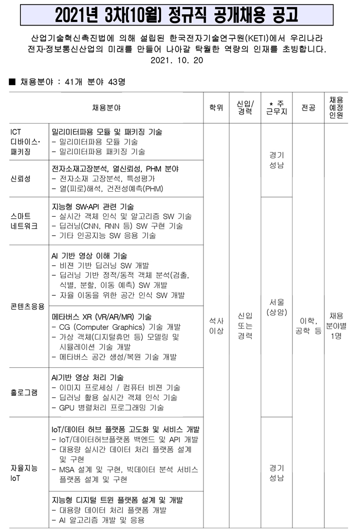 [KETI] 2021년 3차(10월) 정규직 공개채용 공고