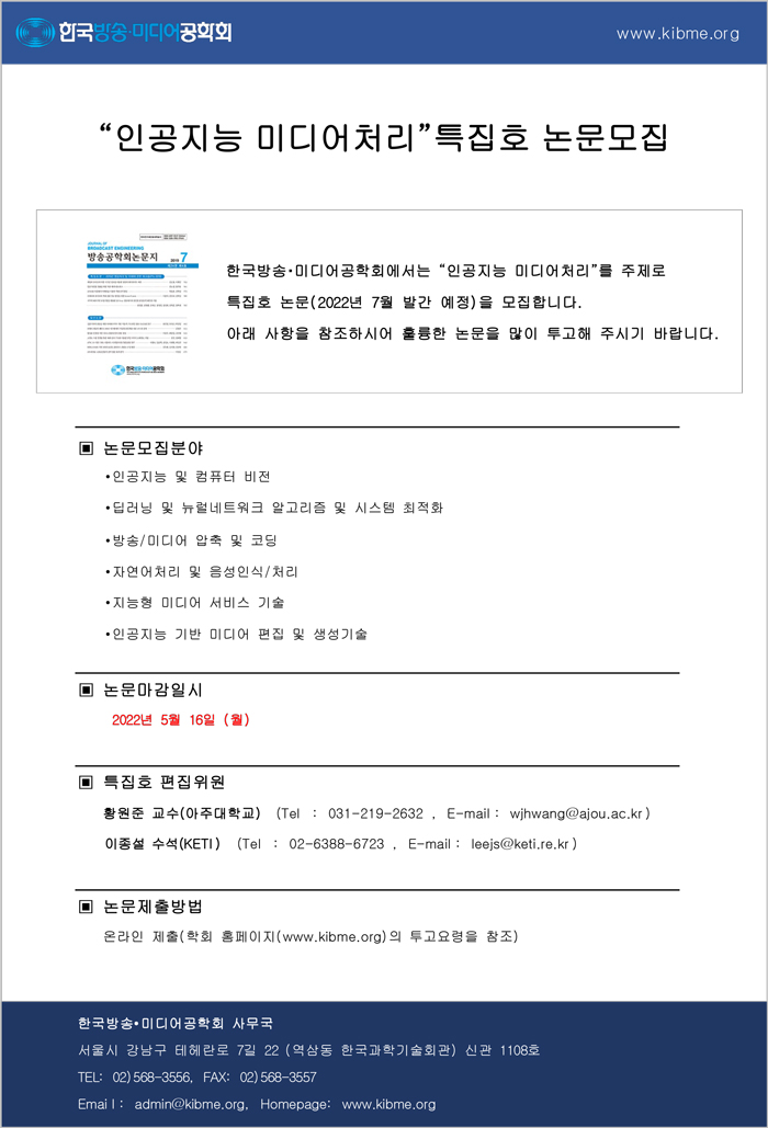 [논문모집] 방송공학회논문지 특집호 '인공지능 미디어처리' (27권 4호, 2022년 7월 발간)