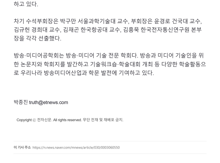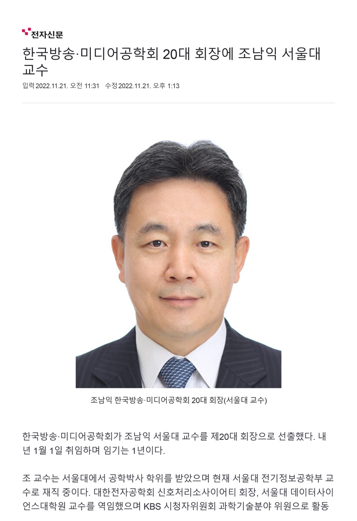 [전자신문] 한국방송·미디어공학회 20대 회장에 조남익 서울대 교수