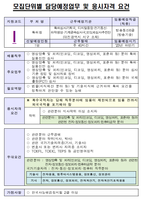특허청은 "영상압축 및 처리(인코딩, 디코딩, 영상처리, 표준화 등) 분야 특허·실용신안 심사"를 위한 심사관 채용을 실시합니다.