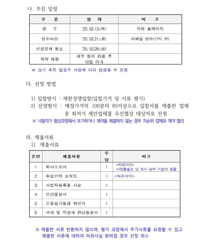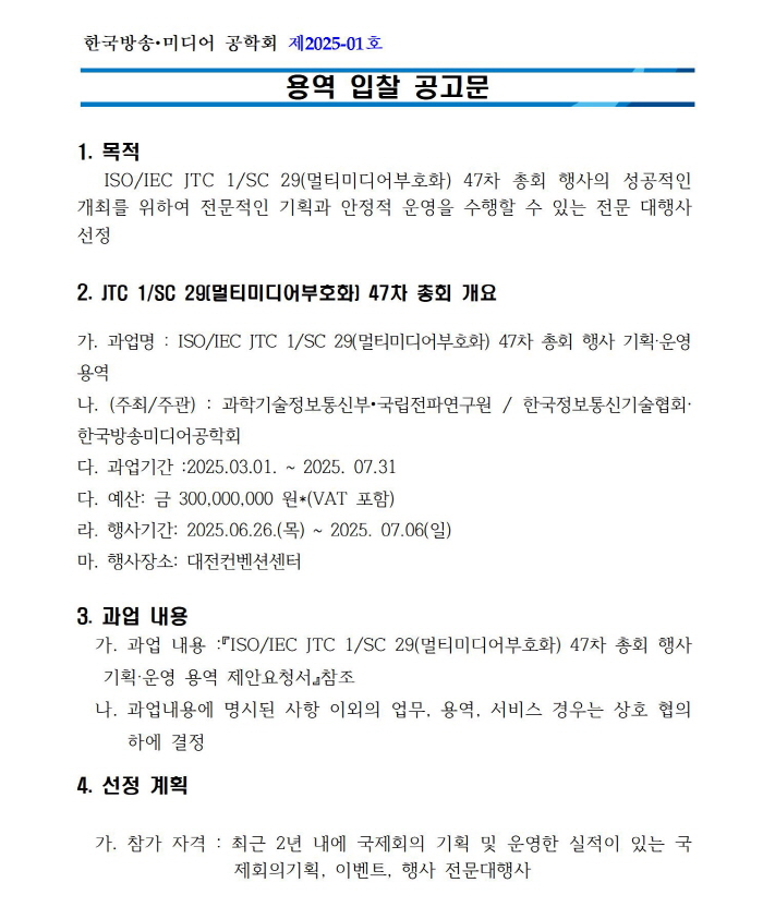 ISO/IEC JTC 1/SC 29(멀티미디어부호화) 47차 총회 행사 용역 입찰 공고문 (2월 21일 17시까지)