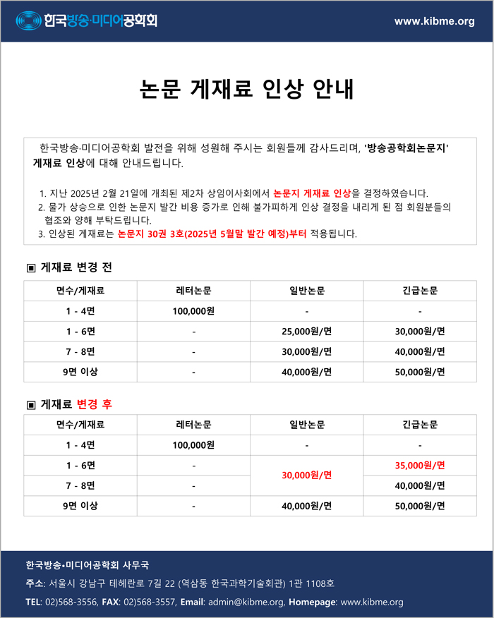 [공지사항] [공지] '방송공학회논문지' 게재료 인상 안내