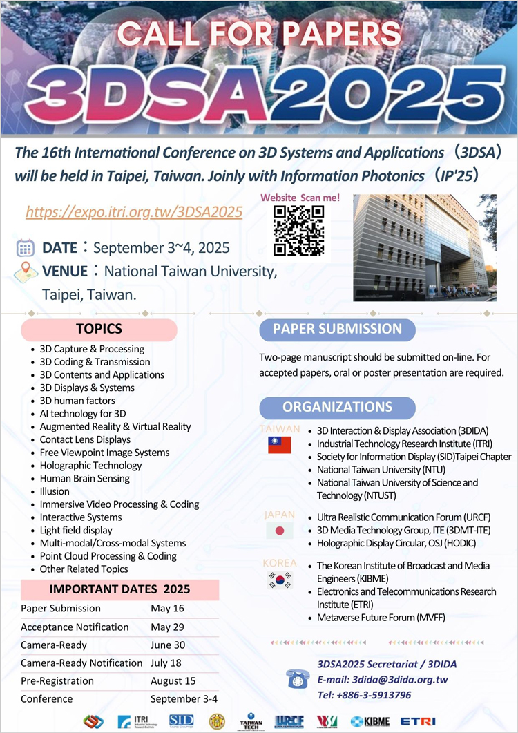 [3DSA 2025] paper submission: May 16, 2025 (September 3~4, 2025. Taipei, Taiwan)