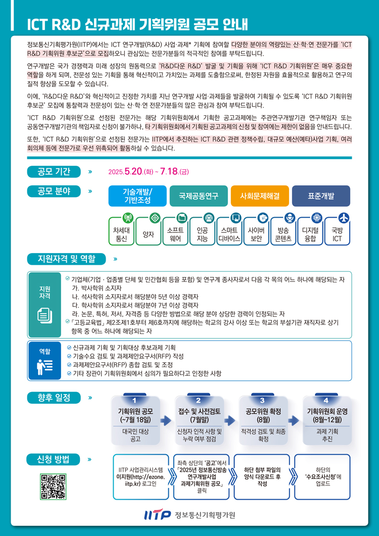 [IITP] 2025 ICT R&D 신규과제 기획을 위한 기획위원 공모 (공모 기간: ~7.18.(금)까지)