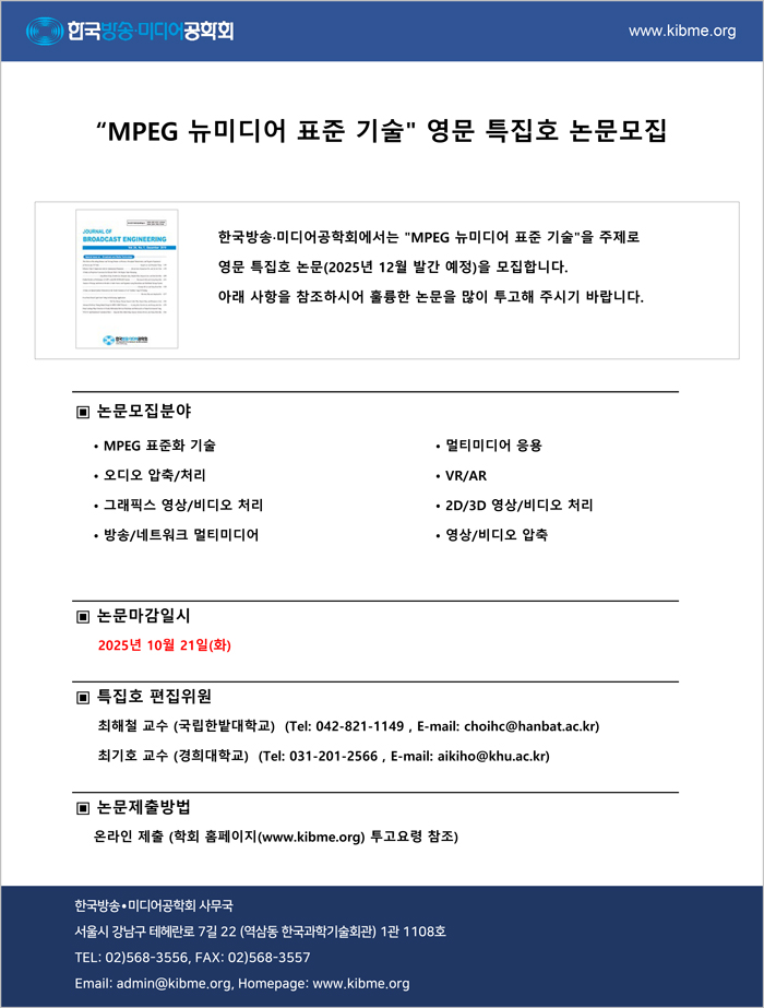 [논문모집] 방송공학회논문지 영문 특집호 'MPEG 뉴미디어 표준 기술' (30권 7호, 2025년 12월 발간)