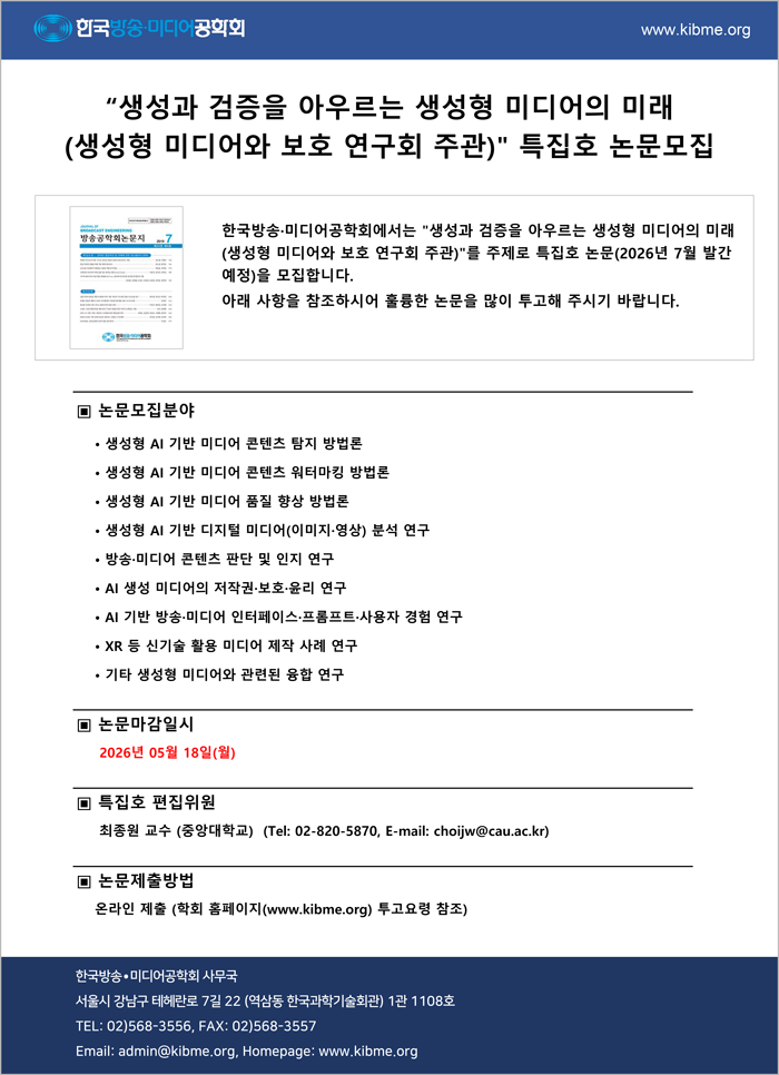 [논문모집] 방송공학회논문지 특집호 '생성과 검증을 아우르는 생성형 미디어의 미래 (생성형 미디어와 보호 연구회 주관)' (31권 4호, 2026년 7월 발간)
